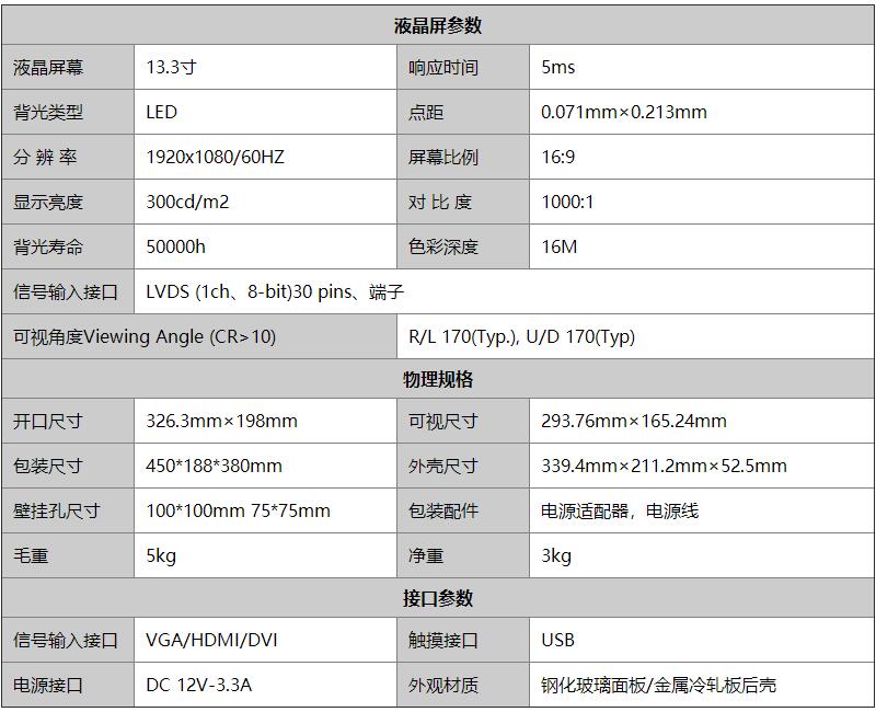 13.3寸工業(yè)觸摸顯示器基本參數(shù)